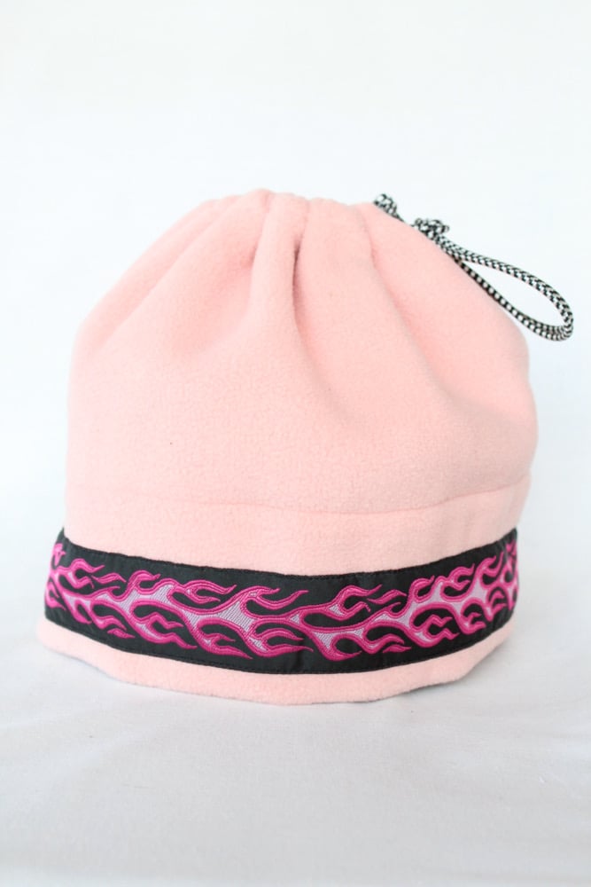 This specific style is the Spring Hat. This design features a cinch at the top so that the hat can convert into a neck gator and slide over your head. This is a lighter, more breathable hat because it is primarily single layered with only two layers of fleece on the fold.
