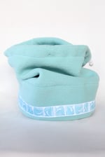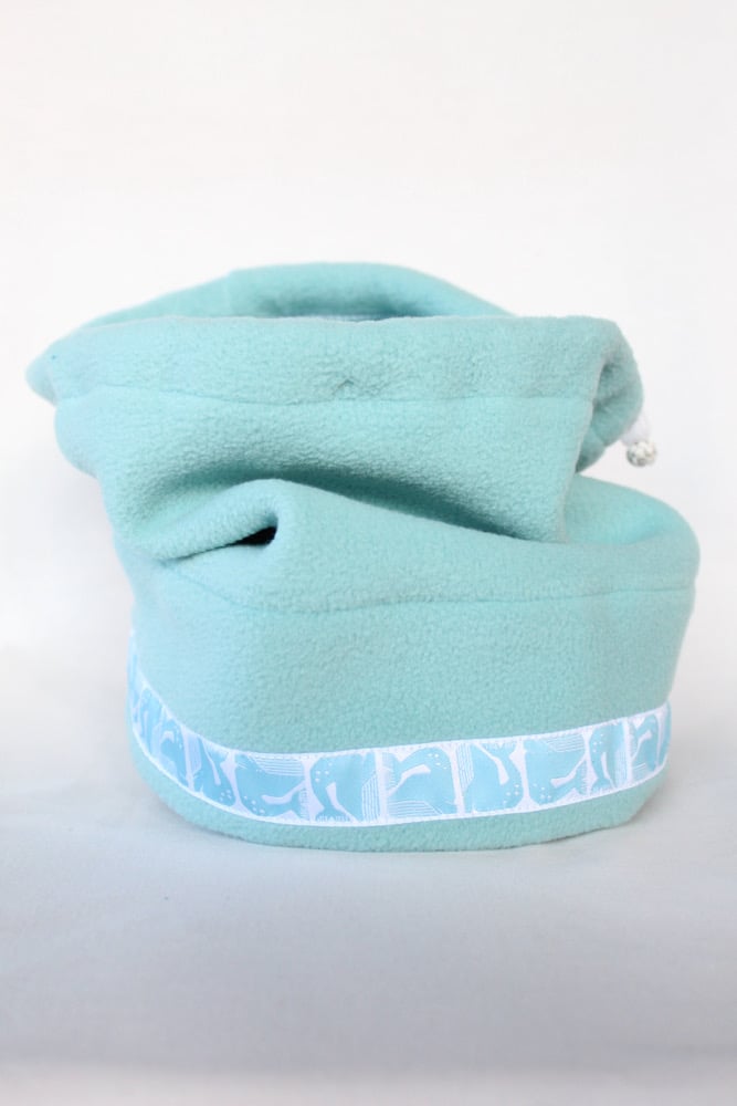 This specific style is the Spring Hat. This design features a cinch at the top so that the hat can convert into a neck gator and slide over your head. This is a lighter, more breathable hat because it is primarily single layered with only two layers of fleece on the fold.