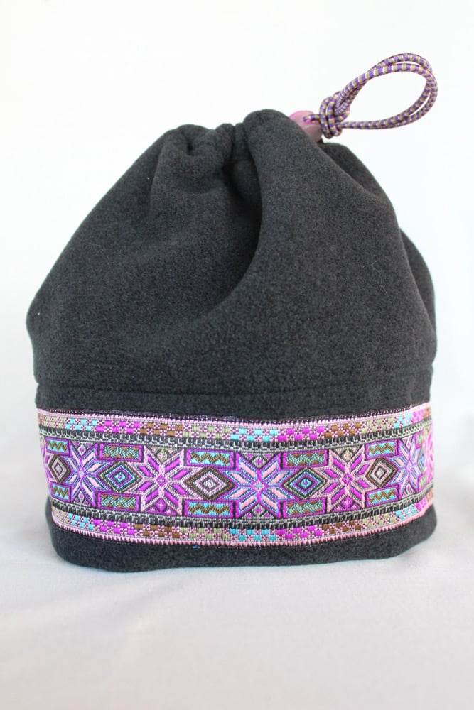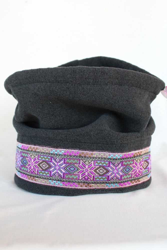 This specific style is the Spring Hat. This design features a cinch at the top so that the hat can convert into a neck gator and slide over your head. This is a lighter, more breathable hat because it is primarily single layered with only two layers of fleece on the fold.