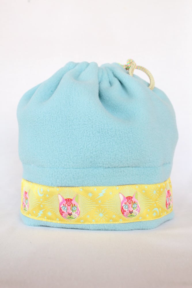 This specific style is the Spring Hat. This design features a cinch at the top so that the hat can convert into a neck gator and slide over your head. This is a lighter, more breathable hat because it is primarily single layered with only two layers of fleece on the fold.